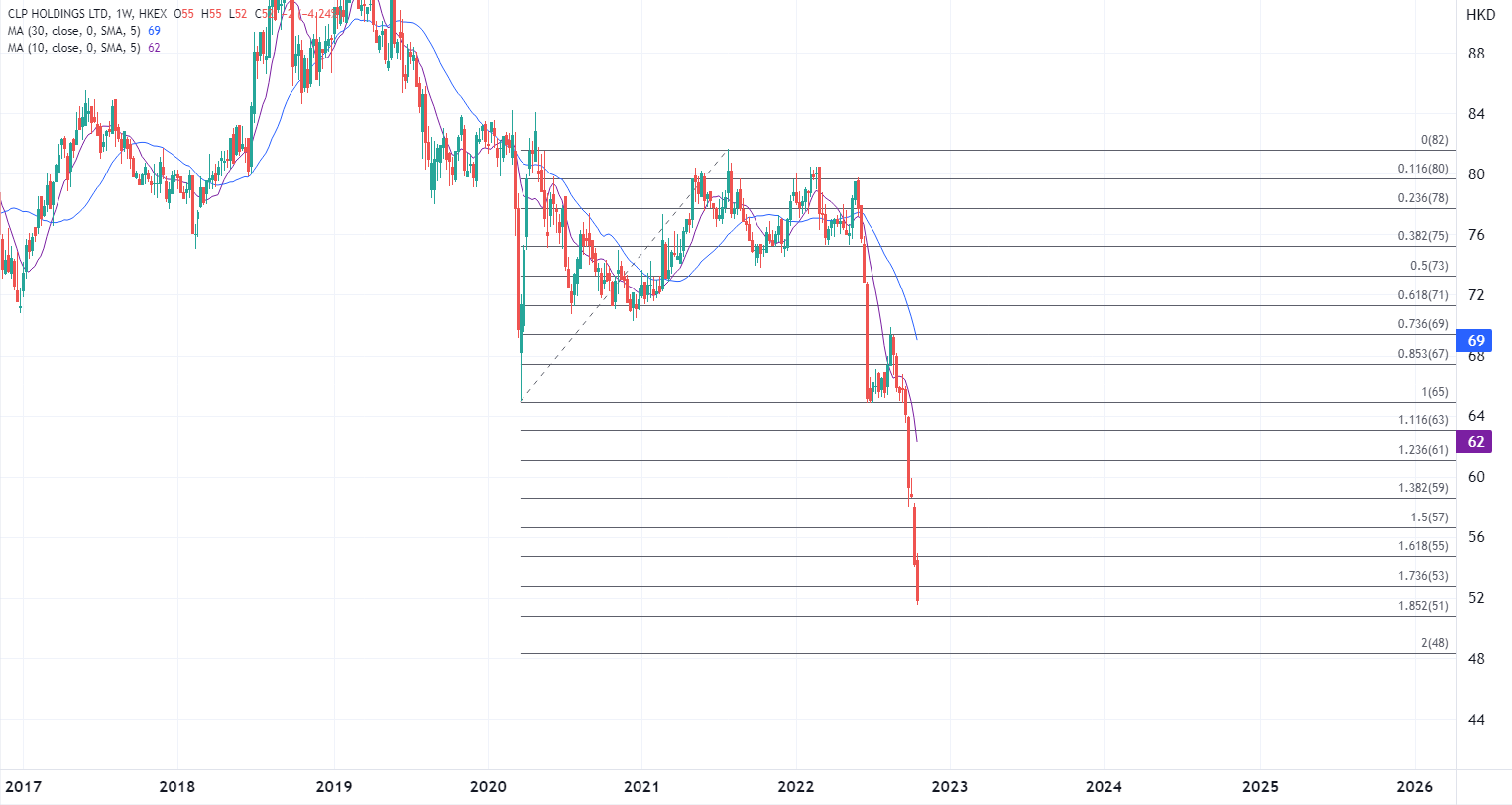 ATFX指,除了内地电力股外,港股中股息率较高的公用股也值得关注,在电力股中,中电控股(0002.HK)在本周宣派第三期中期息每股0.63元(与去年同期相同),但股价受到首三季售电量下跌的影响。日内中电控股股价跟随香港本地公用股向下,创出13年来的最低位,预计在低位会有部分吸纳,尤其关注前低在51港元的支撑。
