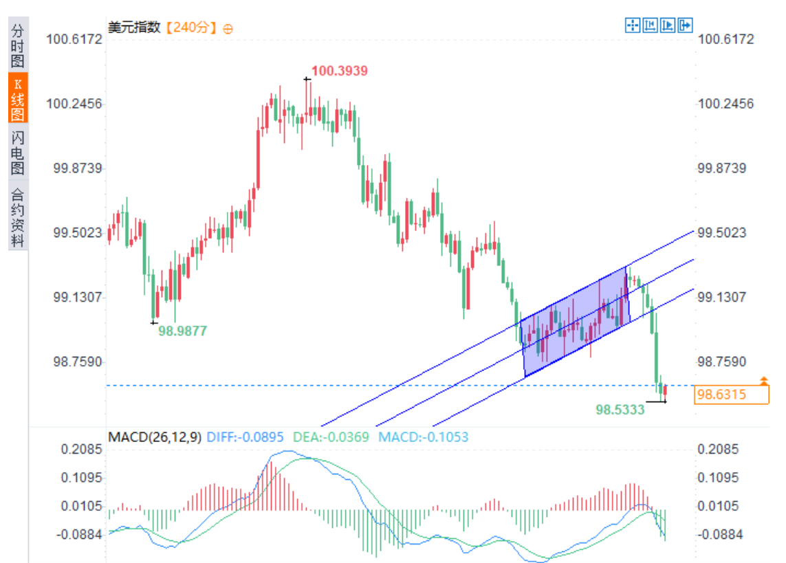 从技术面看,美元指数在决议公布前已形成看跌旗形结构,而这一形态最终演变为破位下行,美元指数正向下一个支撑位98.00滑落。