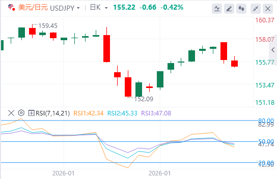 相对强弱指数(RSI)位于39,位于中线以下,显示买盘压力减弱,暗示跌破154.91可能将回调幅度扩大至50%回撤位154.91。后者标志着更深的底层,若有突破,回撤可能延长。